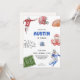 A whimsical and colourful invitation template designed for a kids' birthday party. The layout features playful illustrations of toy cars, trucks, lollipops, clouds, and small houses, bordered by curving roads. The centre is left blank for custom text, making it ideal for adding party details. The design's pastel tones and soft style create a cheerful and friendly vibe.