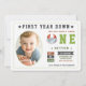 Kick off the celebration in style with this Football Sports First Year Down Boy 1st Birthday Invitation! This horizontal layout features rounded corners, a soft pale green border, and a bold “First Year Down” headline—perfect for your little MVP’s big milestone. With a football-themed design, blocks of sporty text, and a customisable photo template, this invitation blends playful charm with team spirit. Ideal for toddler boys, first birthday parties, football birthday themes, and sports-loving families, it’s a great way to announce your celebration. Whether you're planning a backyard bash, a tailgate-style party, or a cosy indoor event, this personalised 1st birthday invite scores big on style and fun!
