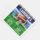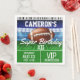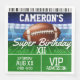 These party napkins feature an American football theme on a green background, designed to resemble a game ticket. A barcode is placed at the top, with the event information printed below. A sample "Super Birthday" title is printed in the centre, followed by Roman numerals to indicate the birthday year. An image of a stadium and field are pictured in the background, with a large football placed overtop.