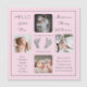 Create a birth announcement that is as unique as your precious child with this "Hello Little One" four photo design featuring your baby's name, birth statistics, parents and siblings' names. In the centre are two template lines for your personal message or you can use ours. This messaging is on top and bottom of your child's optional footprints (add left and right separately). All text and background colours can be modified as desired. Shown here in pink. Design by Holiday Hearts Designs (rights reserved) with template placeholder photos via Unsplash.