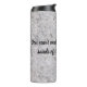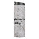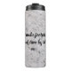 A thermal tumbler featuring a photo of sand and the words ""You can't make footprints on the sands of time by sitting."