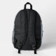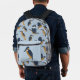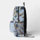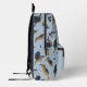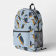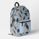 This patterned backpack is perfect for bird lovers. It features illustrations of kingfishers in blue, mustard gold and white set against a patterned light blue background.