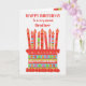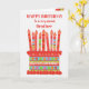 You can add the age to this brightly coloured birthday card for your brother, with a strawberry birthday cake. The cake has lots of candles with different patterns and there is a patterned band around the cake with colourful summer fruits - strawberries, raspberries, limes and orange slices. Above the cake, the greeting, in red lettering, is 'HAPPY BIRTHDAY to a very special Brother' and on the cake there is a space for you to add the age, followed by 'years old today!' in white lettering. Please feel free to customize the inside message if you wish; you can change the font and the colour as well as the message.