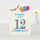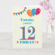 A colourful birthday card for an 12-year-old cousin, The large number 12 is filled with an orange, red and blue pattern, outlined in bright blue. There are balloons and bunting at the top, in matching colours and the front cover greeting is, 'Cousin, you're 12 today!' in bright red and blue lettering, on a very pale yellow and white polka dot background, with red and orange stars each side of the word 'TODAY!'. The inside message can easily be customised or deleted if you wish.