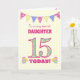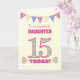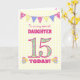 A pretty 15th Birthday card for your daughter, with polka dot bunting, primrose flowers and numbers filled with a primrose pattern, all on a pale yellow check gingham background. The front cover message is, 'To a very special DAUGHTER 15 TODAY!' The inside message is just a suggestion and you can easily personalise it or delete it if you prefer.