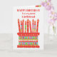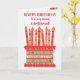 You can add the age to this brightly coloured birthday card for your girlfriend, with a strawberry birthday cake. The cake has lots of candles with different patterns and there is a patterned band around the cake with colourful summer fruits - strawberries, raspberries, limes and orange slices. Above the cake, the greeting, in red lettering, is 'HAPPY BIRTHDAY to a very special Girlfriend' and on the cake there is a space for you to add the age, followed by 'years old today!' in white lettering. Please feel free to customize the inside message if you wish; you can change the font and the colour as well as the message.
