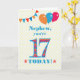 A colourful birthday card for a 17-year-old nephew, The large number 17 is filled with an orange, red and blue pattern, outlined in bright blue. There are balloons and bunting at the top, in matching colours and the front cover greeting is, 'Nephew, you're 17 today!' in bright red and blue lettering, on a very pale yellow and white polka dot background, with red and orange stars each side of the word 'TODAY!'. The inside message can easily be customized or deleted if you wish.