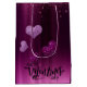 special for Valentine's Day purple pouch with purple background (pink dough violet) and loose hearts of purine and pink purine on the edges of the bag.