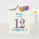 A colourful birthday card for an 12-year-old son, The large number 12 is filled with an orange, red and blue pattern, outlined in bright blue. There are balloons and bunting at the top, in matching colours and the front cover greeting is, 'Son, you're 12 today!' in bright red and blue lettering, on a very pale yellow and white polka dot background, with red and orange stars each side of the word 'TODAY!'. The inside message can easily be customised or deleted if you wish.