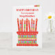 You can add the age to this brightly coloured birthday card for your stepbrother, with a strawberry birthday cake. The cake has lots of candles with different patterns and there is a patterned band around the cake with colourful summer fruits - strawberries, raspberries, limes and orange slices. Above the cake, the greeting, in red lettering, is 'HAPPY BIRTHDAY to a very special Step Brother' and on the cake there is a space for you to add the age, followed by 'years old today!' in white lettering. Please feel free to customize the inside message if you wish; you can change the font and the colour as well as the message.