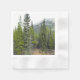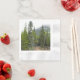 This napkin design features a photo of a forest scene with coniferous trees, along with a mountain in the background.
