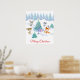 A poster with a whimsical Christmas scene. Happy forest animals dancing around a decorated Christmas tree.
