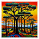 A.I. assisted print of a landscape filled with rolling hills in an array of colours while trees stretch upwards with unique, rounded canopies set against a vibrant sunset.