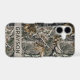 Customize this forest branches camouflage iPhone 17 case with your name in a trendy modern CAP font in gray on opaque cream. It's masculine and perfect for your favorite military, hunting, country or outdoorsman!