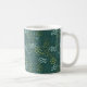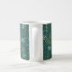 A stylized floral design on dark, spruce green combines white flowers, olive drab ferns, yellow-green grass, and blue-green leafy twigs, creating a beautiful coffee mug that you will love to use. Lovely boho style.