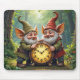 Two cheerful gnomes hold a large clock while standing in a sunlit forest clearing