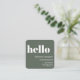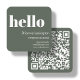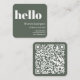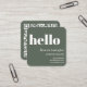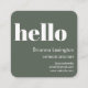 Customisable forest green business card, with HELLO typography and name, profession, website and social media details. On the back there is a scannable QR code. To generate a new QR code on the design that links to your own website, click on the "personalise this template" Add your URL address or social media handle in the area provided and a QR code will be generated just for you.