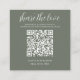 Forest green share the love QR Code cards. Place these small cards at your wedding reception tables so guests can scan to upload the photos they took at your wedding reception to your album or social media. To generate a new QR code on the design, add the URL of your online wedding album or social media handle in the area provided, using the "personalise" feature. A brand new QR code will then be added to to the design.