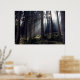 This photo features sunbeams through a forest on foggy day in Bavaria.