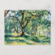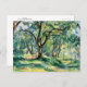 A fine art postcard with the post-impressionist painting by the French artist Paul Cézanne (1839-1906) titled, Forest (c. 1890). A sun dappled landscape with lush green trees.