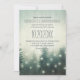 Rustic wedding invitation with spruce trees decorated with fairy lights.
