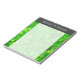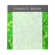 This notepad design features an abstract pattern of many triangle shapes coloured various shades of green. It could perhaps be said to resemble a dense forest of coniferous trees. It also features a personalised name at the top.
