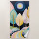 An ethereal and symbolic painting featuring a stylized, abstract forest scene. Tall, teardrop-shaped trees with spindly branches dominate the upper half of the canvas, their canopies in soft shades of pink, turquoise, and gold, with some featuring shimmering gold leaf details. A celestial body, a large orb with concentric rings of blue, purple, and yellow, hangs in the deep blue sky. The foreground is a rolling landscape of rounded hills in various pastels, with a winding, rainbow-colored path leading through them. The overall impression is one of a dreamlike, mystical landscape filled with vibrant colors and geometric forms.