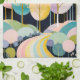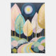 An ethereal and symbolic painting featuring a stylized, abstract forest scene. Tall, teardrop-shaped trees with spindly branches dominate the upper half of the canvas, their canopies in soft shades of pink, turquoise, and gold, with some featuring shimmering gold leaf details. A celestial body, a large orb with concentric rings of blue, purple, and yellow, hangs in the deep blue sky. The foreground is a rolling landscape of rounded hills in various pastels, with a winding, rainbow-colored path leading through them. The overall impression is one of a dreamlike, mystical landscape filled with vibrant colors and geometric forms.