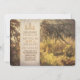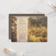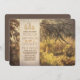 Rustic rehearsal dinner invitation with beautiful forest scenery and rehearsal dinner invitation text written on the old wood board. Romantic invite for your countryside rehearsal dinner in the woods with spruces and other wild trees decorated with string lights.