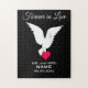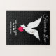 This Forever in Love jigsaw puzzle features a beautiful white dove carrying a heart, and customisable text that has been set against a black background. The last three lines on the item can be personalised with your wedding information.