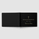 Forever In Our Hearts Gold Black Funeral Memorial Guest Book featuring a gold cross with elegant gold typography on a classic black background. Personalise with the name and year of your dearly departed and add an optional custom text. Perfect for your celebration of life occasion. Easy to customise. Our heartfelt condolences on your loss.