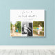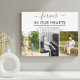 Custom wrapped canvas with remembrance photos and personalised memorial message. The title reads "forever in our hearts" in elegant handwritten script and modern uppercase print. The photo template is set up ready for you to add 3 of your cherished photos and you can also add your own custom wording. The sample memorial note reads "In loving memory of a kind and gentle man" and you can edit this however you wish. The design has a colour palette of black typography on a white background which you can edit by clicking customise further (or you can just message me for assistance).