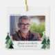Forever in our Hearts Modern yet Rustic Christmas Holiday Photo Square Ornaments featuring little forests of rustic Christmas trees and Merry Christmas in modern typography. Add 2 of your favourite photos for the perfect memorial keepsake ornament! Please contact us at cedarandstring@gmail.com if you need assistance with the design or matching products.