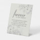 Honour loved ones who are no longer with us using this elegant memorial table sign. Featuring soft ivory tones and vintage dusty blue floral illustrations, this "Forever in Our Hearts" pedestal sign adds a heartfelt, timeless touch to your wedding ceremony or reception décor. A graceful tribute for those remembered in spirit.