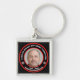 A tribute keychain for friends and family to wear at a funeral with a photograph of your loved one and the words "FOREVER MISSED BUT NEVER FORGOTTEN" framing the picture with their name and dates.