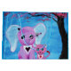 Adorable pink elephant and pink kitty cat sit under a cherry blossom tree. Their hearts are exposed on their chests and also have little hearts on one of each of their ears. The elephant has a ribbon around her trunk to remind her not to forget the special friendship she has with her kitten. Lovely bright blue background really makes the pinks pop.