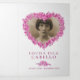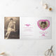 Funeral program order of service gatefold floral heart of forget-me-not flowers art funeral program in white, red-pink, pink, with touches of yellow and green on white paper. Simply replace the sample text and photo holders with your own special photos and information details. Original inked drawing and watercolor artwork and design by Sarah Trett for www.mylittleeden.com (photos are just placeholder images for you to replace with your own).