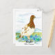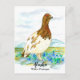 A post card decorated with a Willow Ptarmigan walking in a patch of forget-me-not wildflowers with the Alaskan tundra and snow-covered mountains in the background painted with watercolor. Inspired by the state bird and state flower of Alaska.