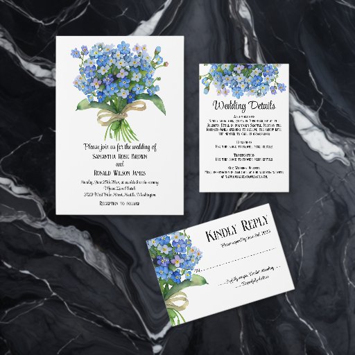 A wedding invitation featuring watercolor forget-me-not flowers on a white background.
