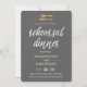 A classic modern rehearsal dinner invitation featuring a faux gold foil fork and knife over a brush script "rehearsal dinner" greeting all in a grey, white and gold colour scheme.