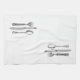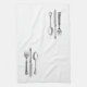 A crisp black and white kitchen towel with decorated with fork, knife and spoon.
