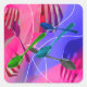 Digital design featuring a background of swirly fun colours featuring cool forks and spoons. Fun kitchen utensils design.