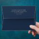 This wedding envelope features a sleek, minimalist design with a deep navy blue background and crisp white text. The layout is clean and balanced, showcasing elegant serif typography that adds a touch of sophistication. Perfect for formal occasions, the design emphasizes simplicity and refinement, making it ideal for couples seeking an understated yet stylish presentation for their special day.