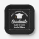 This formal black and white custom graduation party paper plate features classy typography of your high school or college name for the class of 2025. Customise with your graduating year under the chic handwritten script and black grad cap for great personalised modern graduate decor.