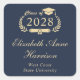 Formal dark blue graduation sticker for your graduation announcements, party invitations and thank you cards featuring "Class of" in a light gold illustration of laurel wreath incorporating a grad cap and diploma, the graduate's name in an elegant light gold script, and their school name in modern light gold typography.