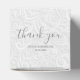 Elegant white on white filigree print pattern with your names and thank you in chic charcoal grey (or any colour) lettering, these 2" square party favour boxes are beautiful for wedding favours, bridal shower favours or any special occasion.