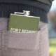 Vinyl wrapped flask features stencil style white font on Army green background.