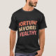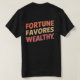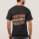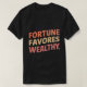 The t-shirt design features the phrase "fortune favours wealthy" in an elegant, vintage typewriter font on a black background. The design is simple and eye-catching, with the phrase being the focal point.