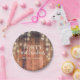 Rustic brown wood with string light design paper plates. Edit font and colour to customise it further.