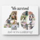 Commemorate your forty years of marriage with our Forty-Year Wedding Anniversary Photo Collage Tabletop Plaque with Easel. This elegant collage beautifully arranges 15 cherished photos in the shape of a number "40", allowing you to relive the special moments from each month of your journey as a married couple. Expertly printed on premium-quality material, the collage is designed with a sleek built-in easel for easy display on any tabletop or shelf. There is text that reads " We survived 40 years and our love is still strong". If you like, you can personalise this text with your own message instead.